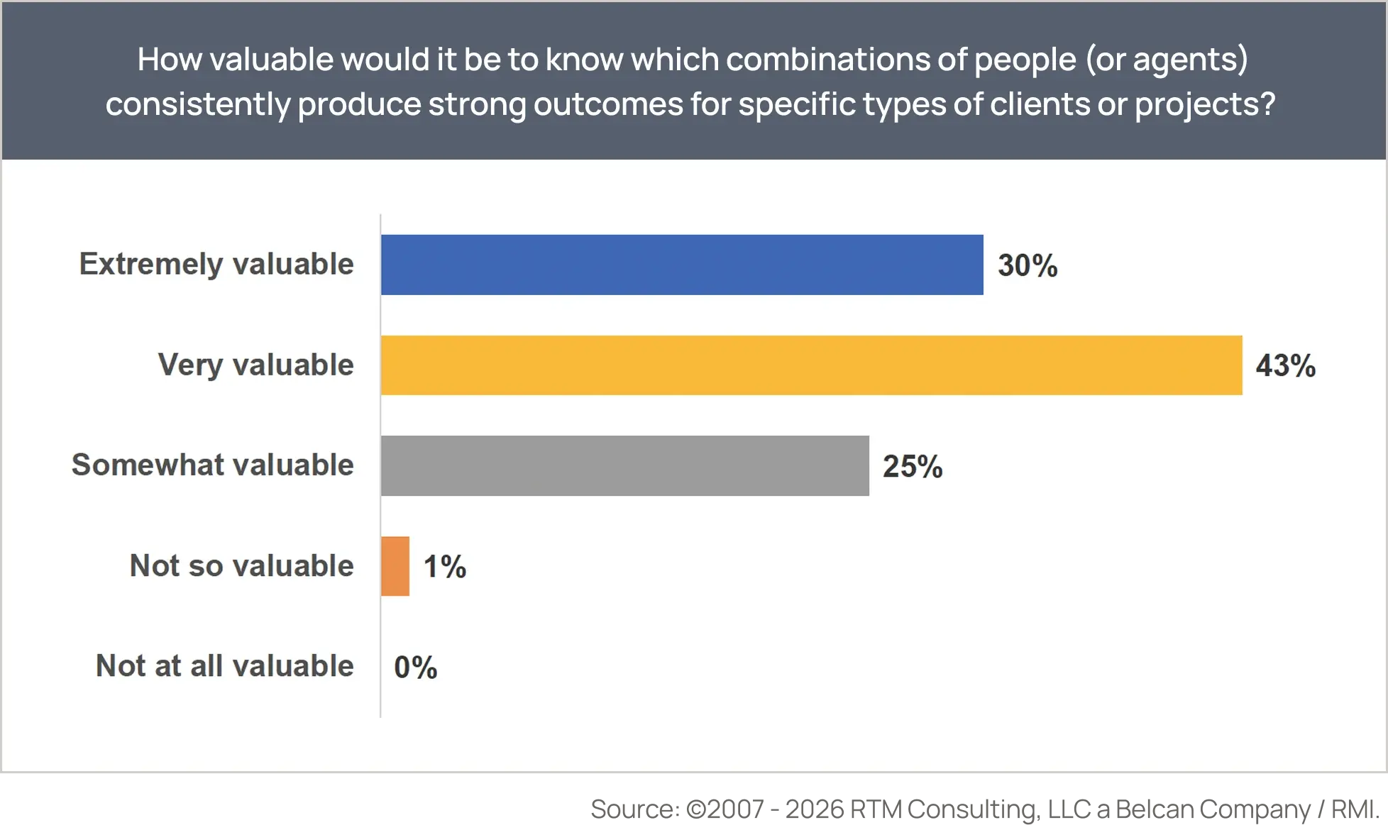 Knowing which combinations of people (or people and agents) consistently produce strong outcomes for clients is one of the most powerful tools for smarter resource management. 73% of firms agree, saying it'd be “very” or “extremely” valuable to have that intel.