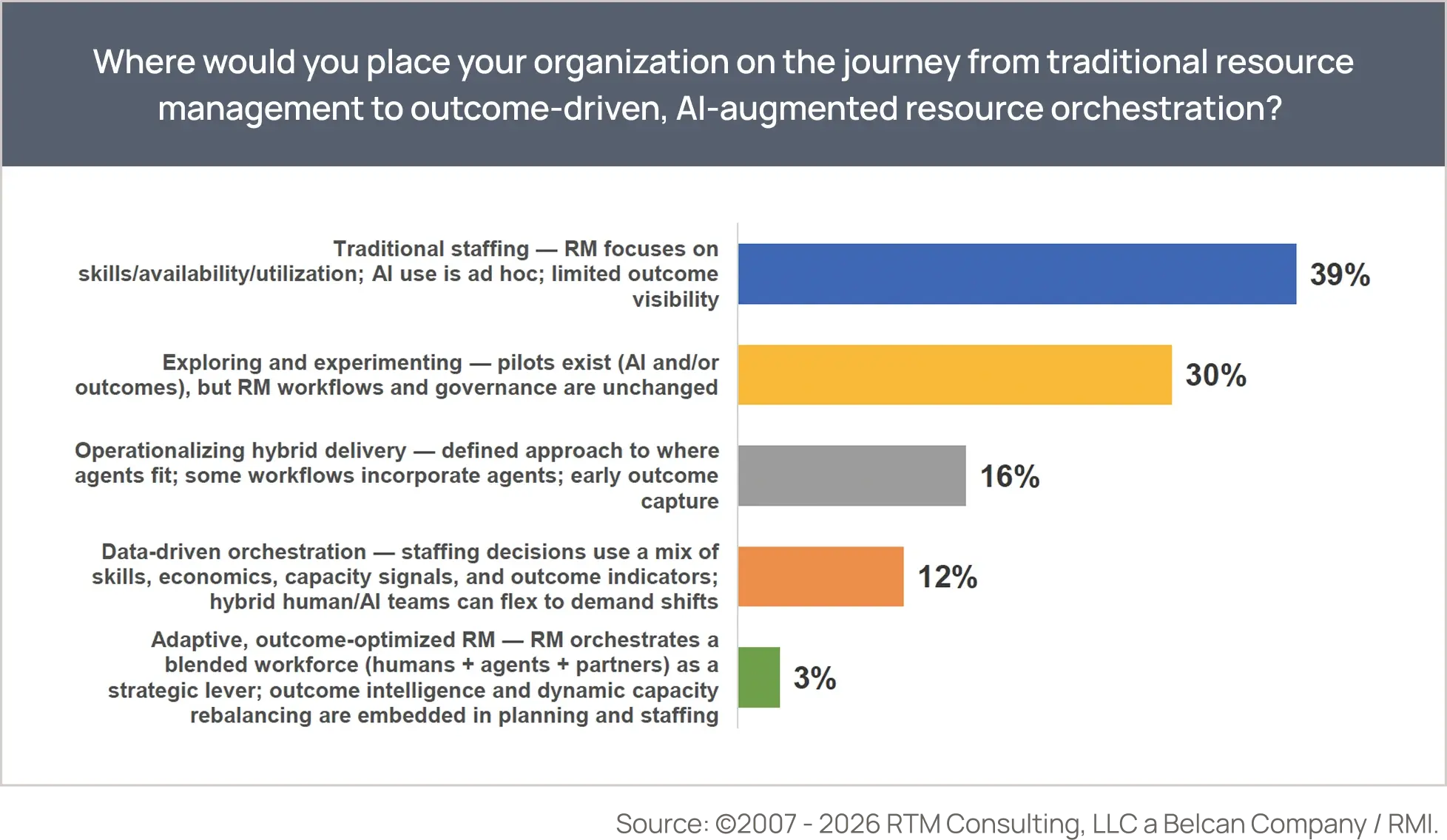 Everyone's talking about AI transforming resource management, yet most firms are earlier in the journey than you’d think. When asked, 39% said they’re in traditional staffing mode with ad hoc AI use. Another 30% are just now starting to explore, with no workflow changes.