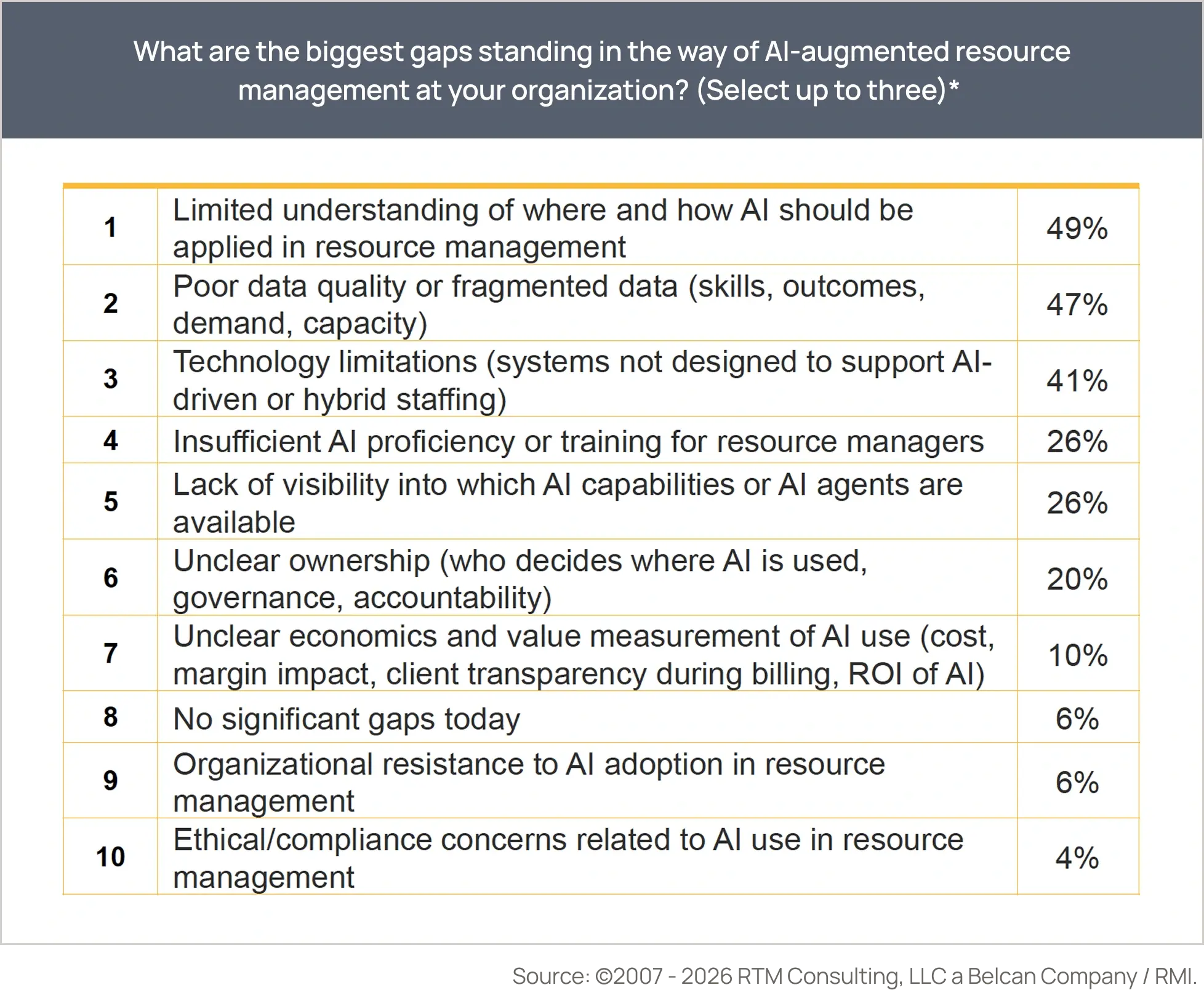 Using AI for resource management relies on data — good data. But most firms simply aren't there yet. 47% of firms cited poor data quality or fragmented data across skills, outcomes, demand, and capacity as the biggest gap standing in the way of AI in resource management.